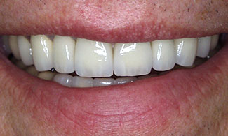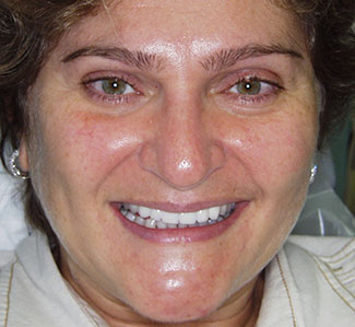 Before AfterJoan had her old veneers replaced with new creative porcelain crowns. Her case included implants for the back teeth as well. Joan's teeth were lengthened and spaces closed to transform her upper teeth. She now smiles with more confidence and feels more youthful.
